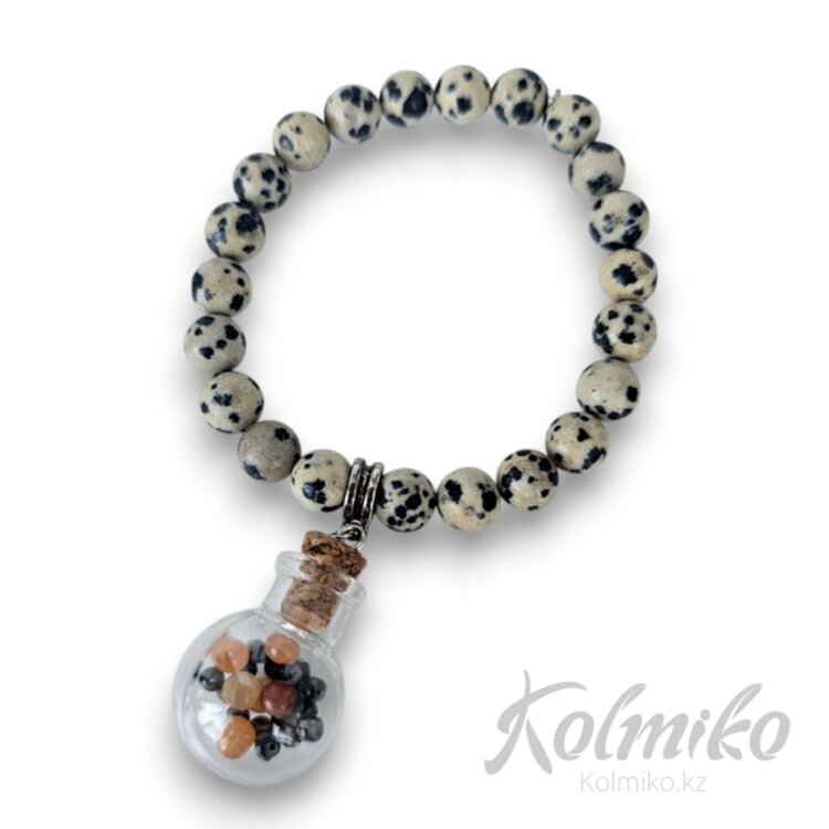 Браслет из далматиновой яшмы с кулоном-бутылочкой — стильный оберег с секретом внутри.