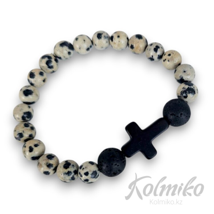 Браслет из далматиновой яшмы, вулканической лавы с крестом из агата — мощная защита и гармония в стильном аксессуаре.